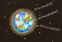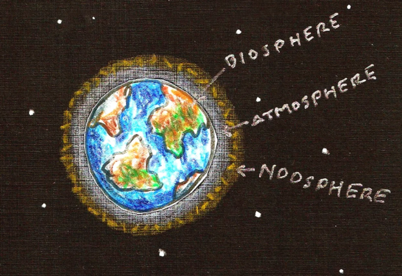 "Noosphere." — the idea that Earth evolves from a geological sphere (geosphere) to a biological sphere (biosphere), and into a sphere shaped by conscious human thought: the noosphere. A living layer of “collective intelligence”.